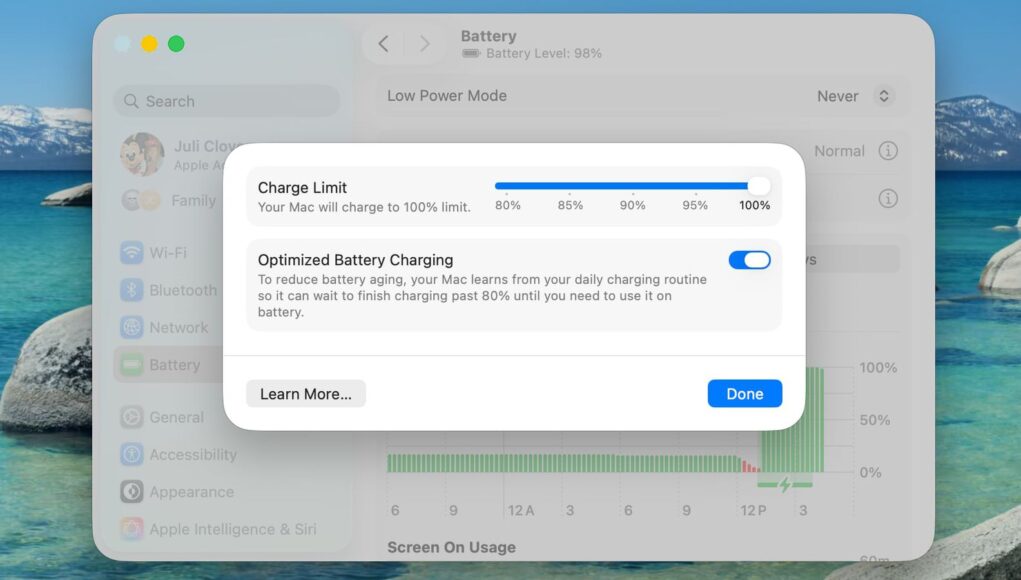 To activate this feature easily, you can click on the Apple logo icon in the menu bar and open the system settings, then go to the battery section in the sidebar and click on the information button next to the charging option. Then you can drag the charging limit slider to your preferred level, whether it is 80, 85, 90, 95, or even 100%, and then click on the Done option. Your computer will now stop charging once it reaches the level you chose, with the enhanced charging feature continuing to work in the background unless you turn it off from the same panel, noting that even with the limit set below 100%, the system will fully charge the battery from time to time to maintain accurate power level estimates, but it will stick to the specified maximum most of the time.