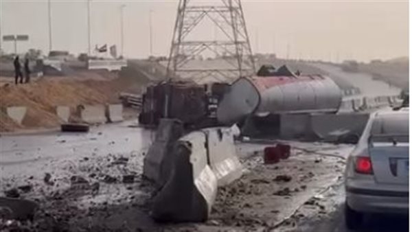 This morning, there was an accident in which a truck loaded with diesel overturned in the middle of the road in 6th of October City, affecting traffic on the road.