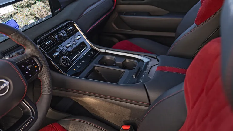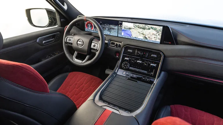 Car supplied Nissan Armada Nismo model 2026 It has many features, including wide side fenders, a front grille clearly bearing the NISMO logo, red touches surrounding the car from the bottom that give the impression of speed even when it is standing, huge 22-inch wheels, large 12.3-inch screens, and physical climate control buttons.
